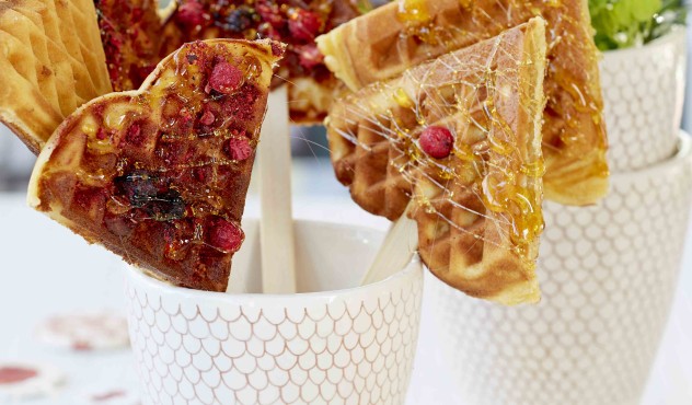 - Greitais judesiais šakute ar šaukšteliu ant vaflių vedžiojame karamelines gijas, pabarstome džiovintomis uogomis, šokolado drožlėmis, sėklomis ar smulkintais riešutais.
